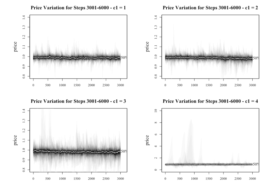 The results of the latter half of the runs are provided in Figure 20. The points of notice from the graphs are; bubbles still appear beyond 3,000 steps because of agents taking longer to generate the positive feedback loop that results in the formation of the bubble, and the series with higher levels of c1 (3 or 4), generates higher volatility.