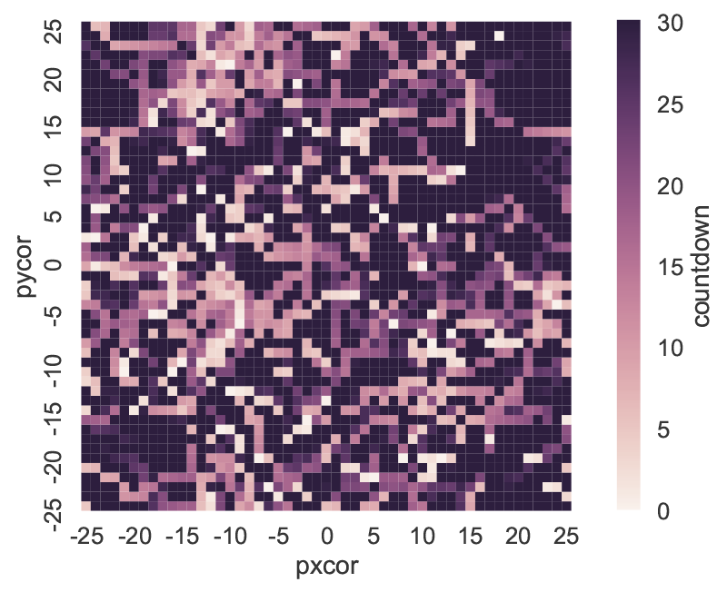patch_report method: distribution of the countdown patch attribute across the NetLogo environment.Using Python for global sensitivity analysis on a NetLogo model