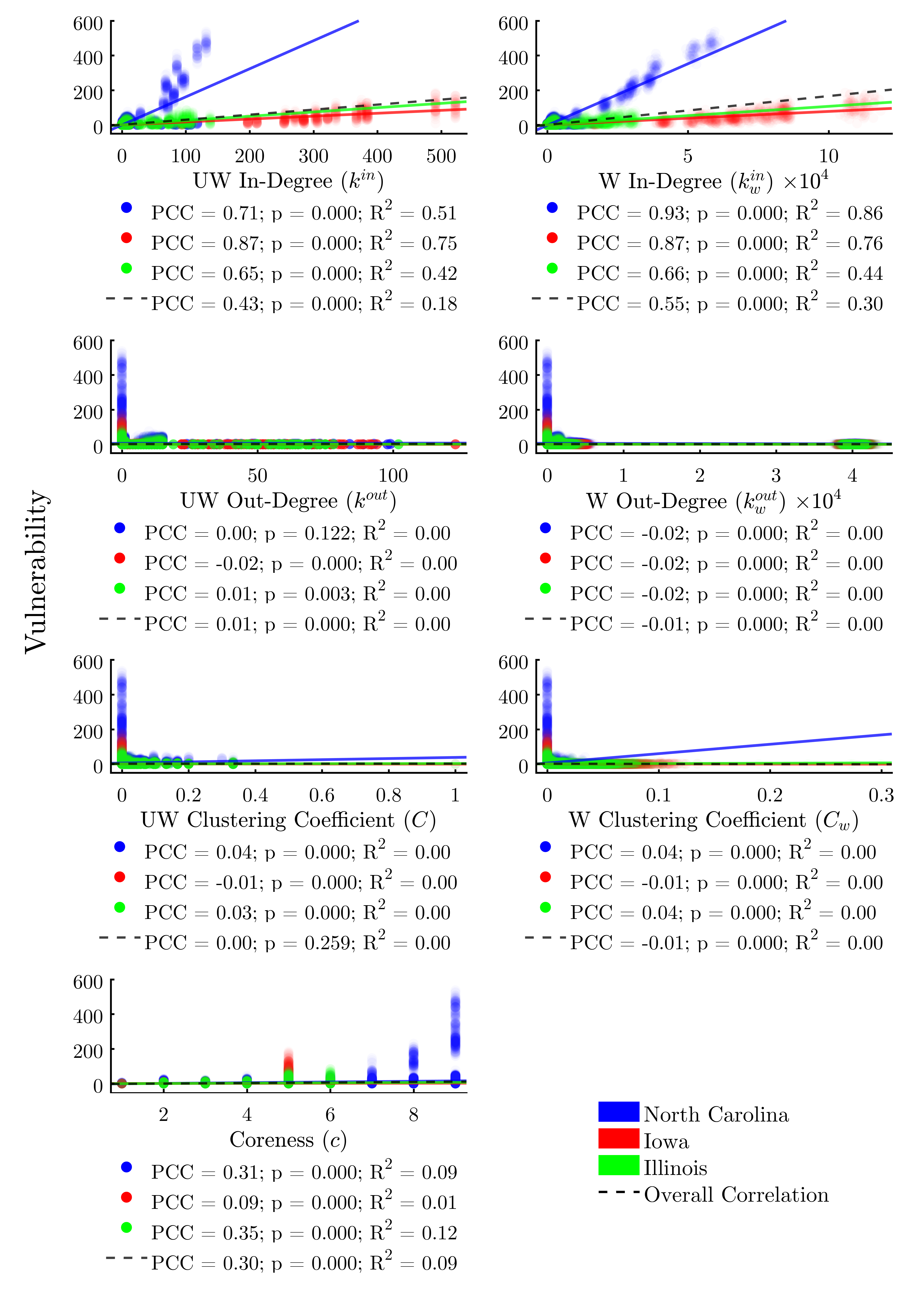 Several of the node-level metrics, such as degree centrality and weighted in-degree, perform reasonably well as predictors of an agent’s vulnerability (R2 = 0.22 and 0.30 respectively). However, many of the node metrics demonstrate differential correlation coefficients across each study area, indicating that risk cannot be accurately predicted by node-level indicators alone (Figures 7 and 8).