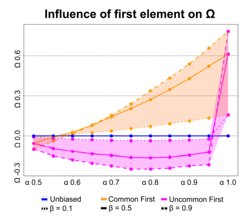 We analyzed differences between runs in which either the common, or the uncommon type of signal is the first one presented to agents, since the bias of agents in the model is formed based on the first type of signal they detect. The \(\Omega\) of biased agents is dependent on the first event presented to them, see Figure 7. Biased agents have higher \(\Omega\) after 100 events when the more common type of event is shown first (orange) compared to when the less common type of event is the first one (pink). Dashed lines represent very strongly biased agents (\(\beta\) = 0.9), solid lines represent moderately biased agents (\(\beta\) = 0.5), and dotted lines represent weakly biased agents (\(\beta\) = 0.1). The filled in colors between the dashed and the dotted lines represent results from agents with \(\beta\) \(>\) 0.1 and \(\beta\) \(<\) 0.9. The blue line shows the results of unbiased agents, whose \(\Omega\) is not influenced by the order in which the events happen or the value of \(\alpha\).