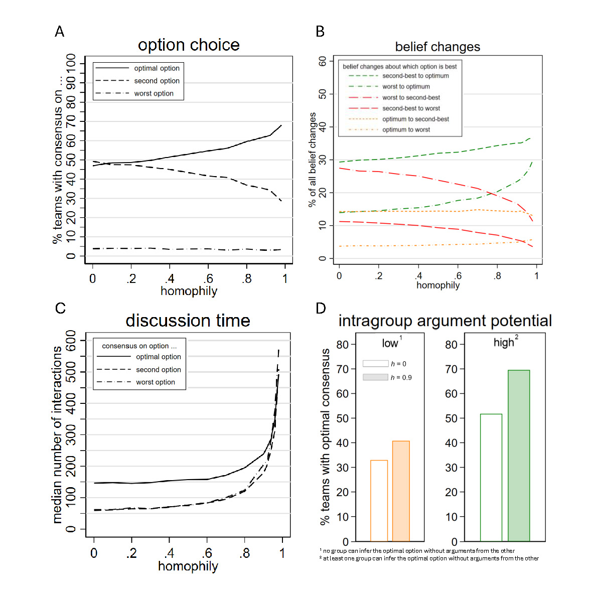 This explanation implies that homophily has a much more powerful effect when at least one of the groups has sufficiently strong optimal arguments to identify the best option by themselves and without the help of the other group. Figure 3D supports this conjecture, showing how homophily increases the share of teams with optimal consensus to a great extent (i.e., from 51% with \(h = 0\) to 71% with \(h = 0.9\)) when the arguments initially provided to one group are sufficient to infer the optimal option. However, when neither group can infer the optimal option without the other, homophilous interactions still increase the chances of making optimal consensus, but only slightly (34% to 40%). The smaller effect is explained by the fact that homophily still prolongs discussion time, making it more likely that optimal unique arguments spread within groups by chance. Altogether, it follows that homophily improves consensus quality mostly because it grants one group with the time to uncover unique arguments and arrive at the optimal option. At the same time, it hinders another group from quickly convincing the team to prefer a suboptimal option through the dissemination of inferior arguments.