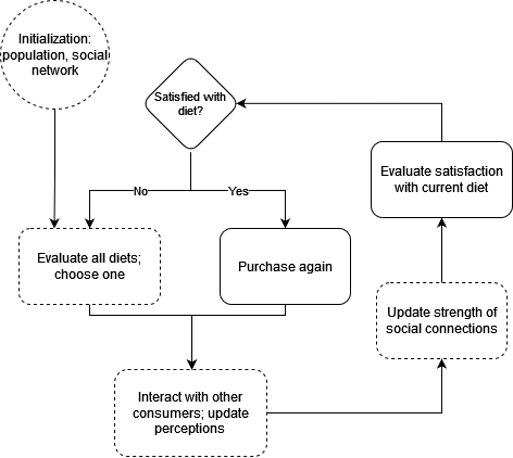 Consumers follow the same overall strategy for diet selection, interaction, and changes to perceptions due to this interaction. However, given the differences in state variables and parameters, the exact outcome of these decisions will vary considerably across consumers. Additionally, the stochastic elements present in decision-making and influence mean that even identical consumers in the same situation could make different decisions, and consumers may influence each other differently.