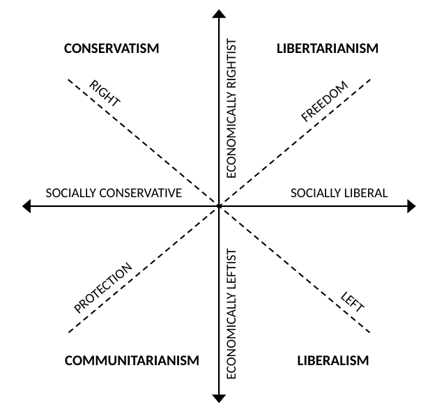 Political opinions are often represented as points in the two-dimensional space depicted in Figure 1. In this representation, opinions are reduced to two values: a social (or sociocultural) attitude and an economic attitude. The social attitude summarizes positions on issues such as individual liberties, law enforcement methods, and the separation of church and state. The economic attitude summarizes positions on fiscal policy, social welfare, market regulation, and so on (Feldman & Johnston 2014; Knight 1999; Swedlow 2008; Treier & Hillygus 2009).1 Each quadrant of the opinion space corresponds to a broad ideology: libertarianism, conservatism, communitarianism, and liberalism (Janda et al. 2020; Swedlow & Wyckoff 2009).2