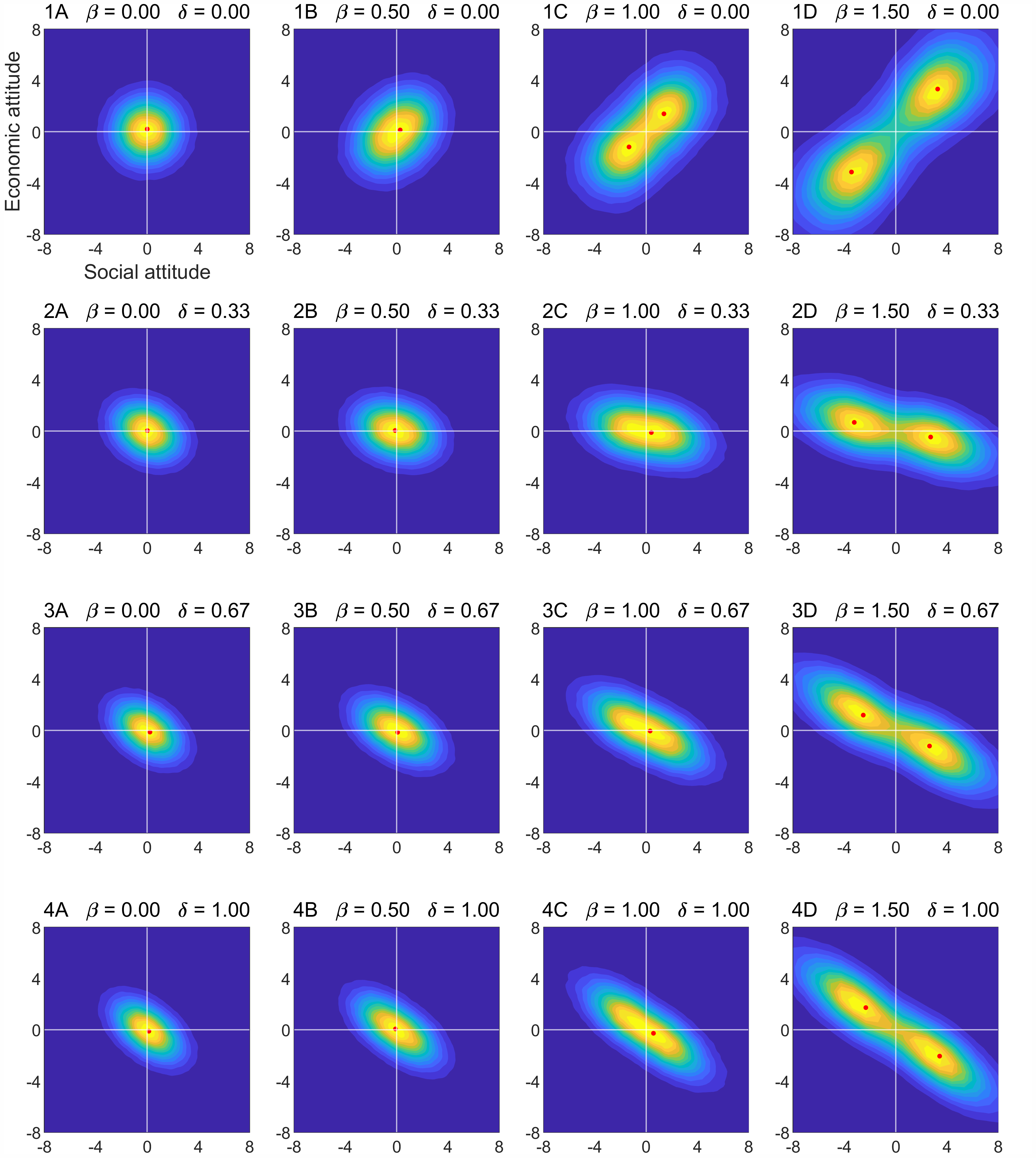 Figure 2 shows snapshots of the final state of several simulations. Each simulation was run with a unique combination of congruence bias (\(\beta\)) and political engagement (\(\delta\)). For \(\beta\), we used 0 (no bias), 0.5 (low bias), 1 (medium bias), and 1.5 (high bias). For \(\delta\), we used 0 (no engagement), 0.33 (low engagement), 0.67 (high engagement), and 1 (full engagement). The simulations reveal five types of steady-state equilibria: