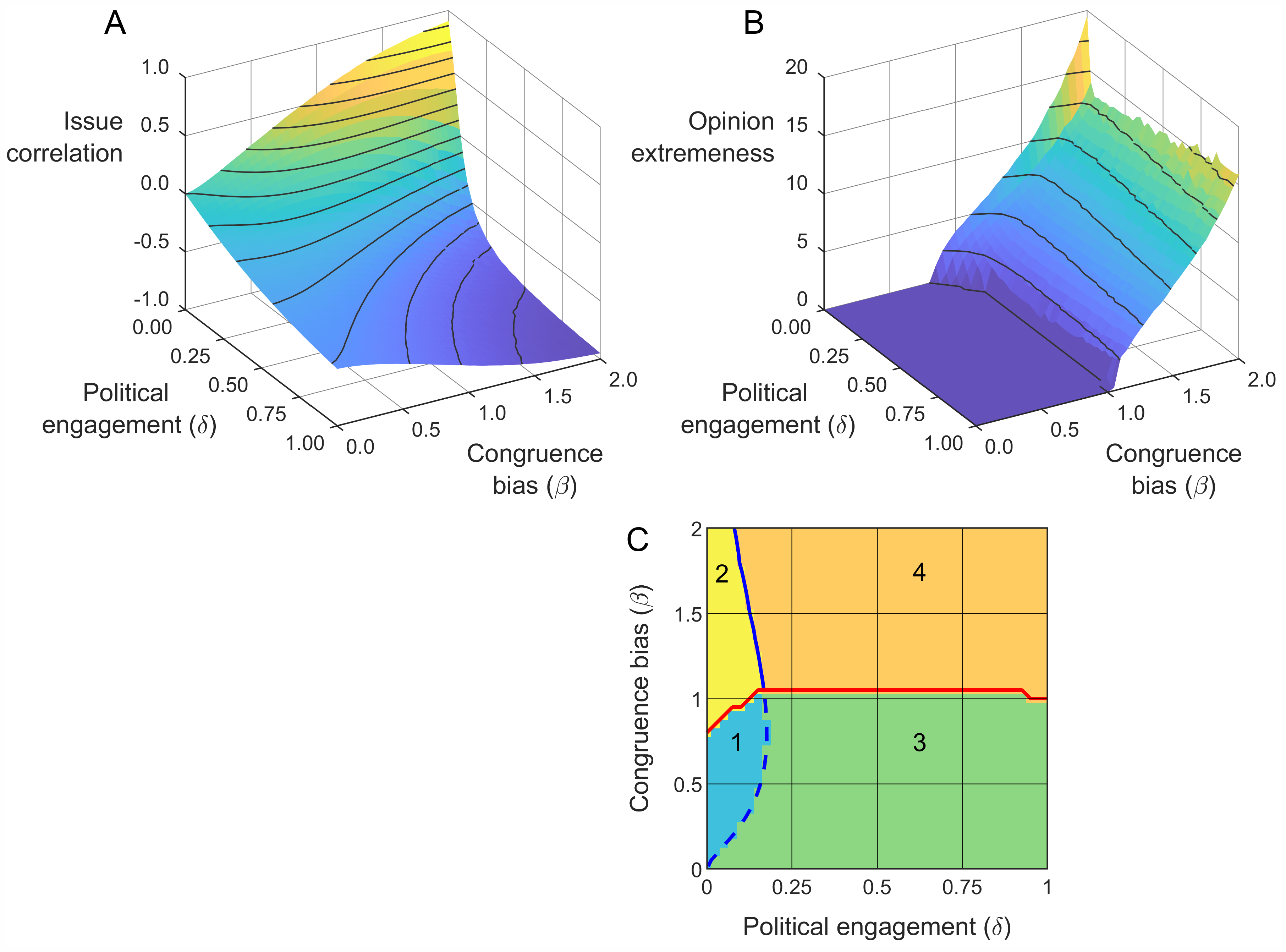 Figure 3 details how congruence bias and political engagement determine the system’s emergent properties. Panels A and B present sensitivity analyses for issue correlation and opinion extremeness, while Panel C maps equilibrium types across the parameter space.