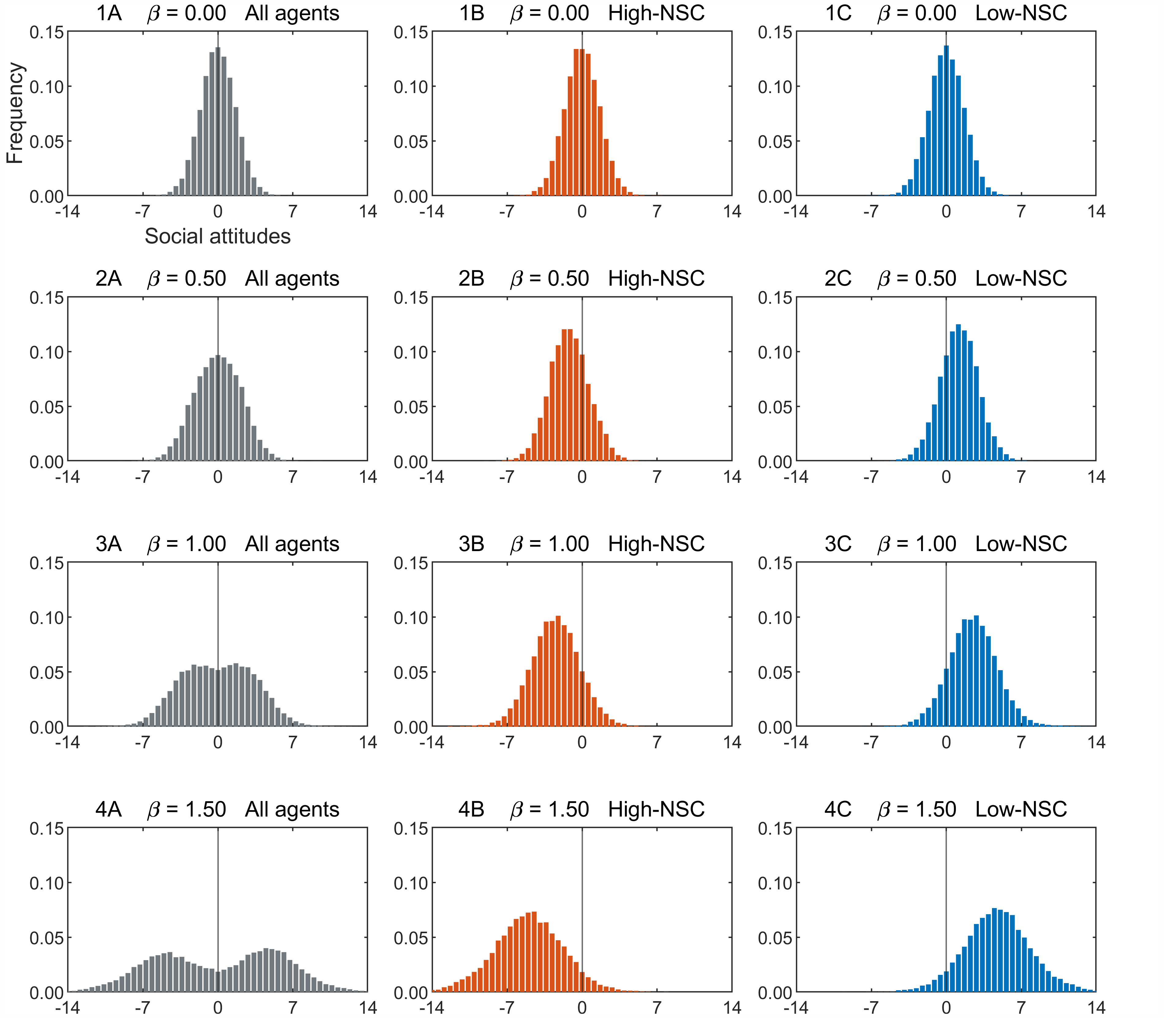 Figure 4 shows the steady-state distribution of social attitudes in simulations with increasing levels of congruence bias (column A). The figure also shows the attitude distributions of two subgroups: high-NSC agents (column B) and low-NSC agents (column C). Both distributions are unimodal, regardless of the level of bias. When peer influence is unbiased (\(\beta = 0\)), high-NSC and low-NSC agents have identical attitude distributions, resulting in a unimodal population distribution. No polarization occurs in this case. As bias increases, the distributions separate: High-NSC agents shift toward the conservative side, low-NSC agents shift toward the liberal side. At low bias levels (\(\beta = 0.5\)), the distributions remain close enough to maintain significant overlap, keeping the population distribution unimodal. Again, no polarization occurs. But at medium or high bias levels (\(\beta = 1, 1.5\)), the two distributions move far apart, so they have little overlap. The population distribution becomes bimodal, and bipolarization emerges.