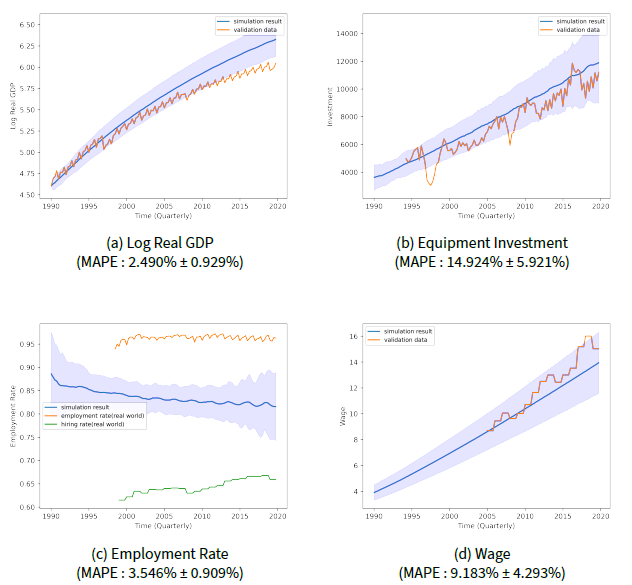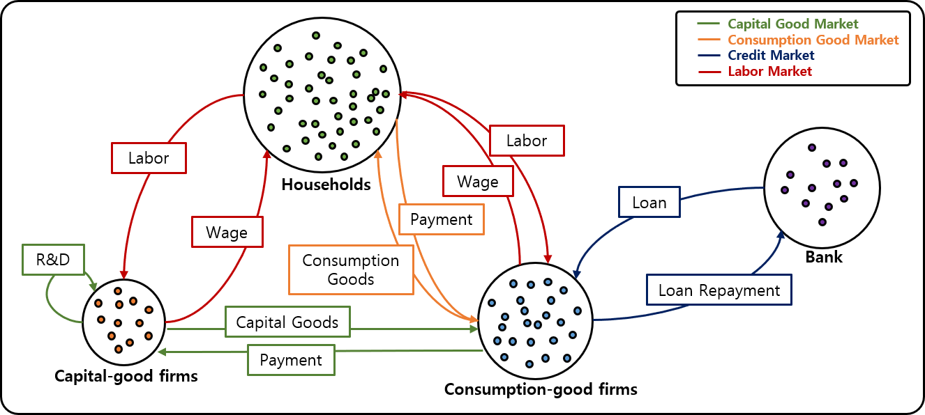 However, previous studies overlooked the interactions among the agents. Indeed, a firm’s growth, which is a micro factor of market concentration, is influenced by the behaviors of other agents in the market. For instance, innovation results, as key drivers of growth, diffuse from one firm to competitors because firms imitate each other’s technologies. Additionally, a firm’s growth is heavily influenced by the level of technology of its suppliers and the extent of its transactions with them. In addition, banks selectively provide limited financing to firms based on their preferences. Finally, the wage that the household receives is affected by the average level of labor productivity in the economy; therefore, one firm’s increase in productivity may indirectly affect other firms’ burden of hiring labor. Previous methods, such as dynamic stochastic general equilibrium (DSGE) or traditional statistical models, fail to account for the influence of complicated interactions on aggregated variables.