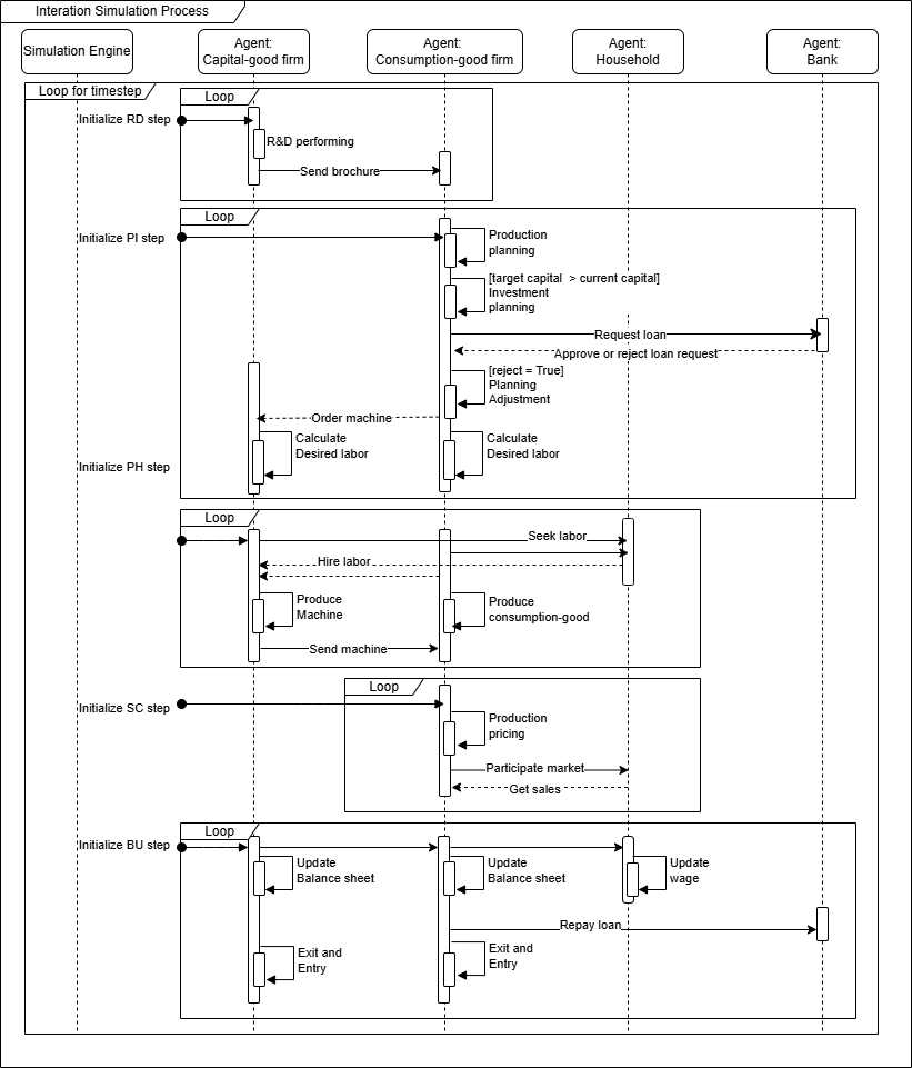 The simulations involve each agent repeating a series of decision steps: 1) Research and Development (RD), 2) Planning and Investment (PI), 3) Production and Hiring (PH), 4) Sale and Consumption (SC), and 5) Balance-Sheet Update (BU). A complete cycle of these five decision steps constitutes one time step and each time step corresponds to a single real-world quarter. Figure 2 shows a sequence diagram of the proposed model. We also provide our code on COMSES: https://www.comses.net/codebases/a7827ec7-4b25-43db-91b1-80bc1f37a0dc/releases/1.0.0/