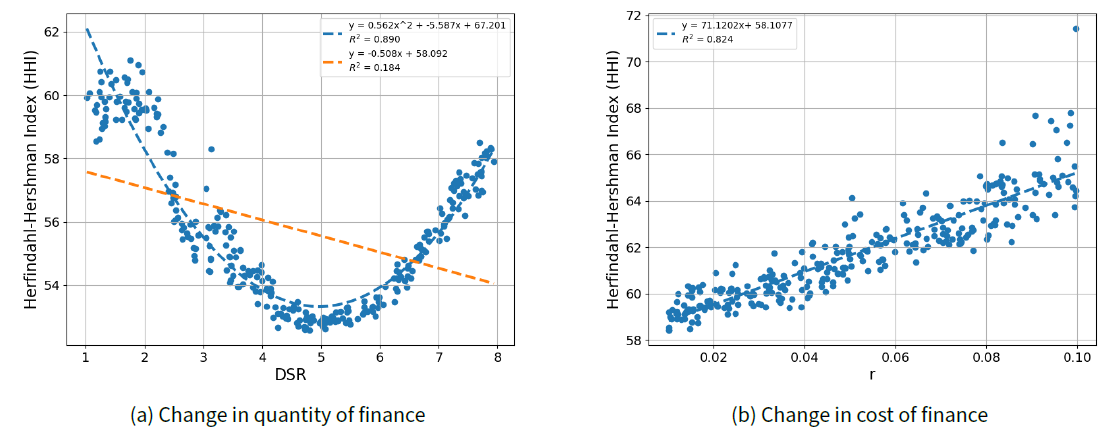 This study has several political and academic implications. From a policy perspective, DSR regulation, traditionally considered a macroprudential tool, can be effective when used alongside interest rate policies. However, excessively relaxing such regulations may inadvertently exacerbate inequalities among firms, underscoring the need for a balanced approach to policy implementation. From an academic perspective, the nonlinear trend observed in relation to DSR regulation highlights an integrated outcome within a single framework, encompassing the dichotomy in existing studies that argue that financing either increases or decreases market concentration.