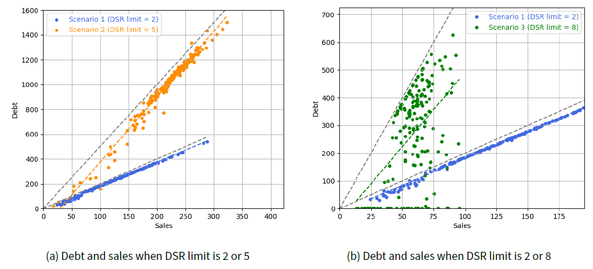 Using the validated model, we conduct policy experiments to analyze how financing affects market concentration, economic growth, and labor income share. We employ two major financial policies as proxies for finance: the debt-to-sales ratio(DSR) and the interest rate, which represent control over the quantity and cost of financing, respectively. The experiments aim to answer the following research questions.