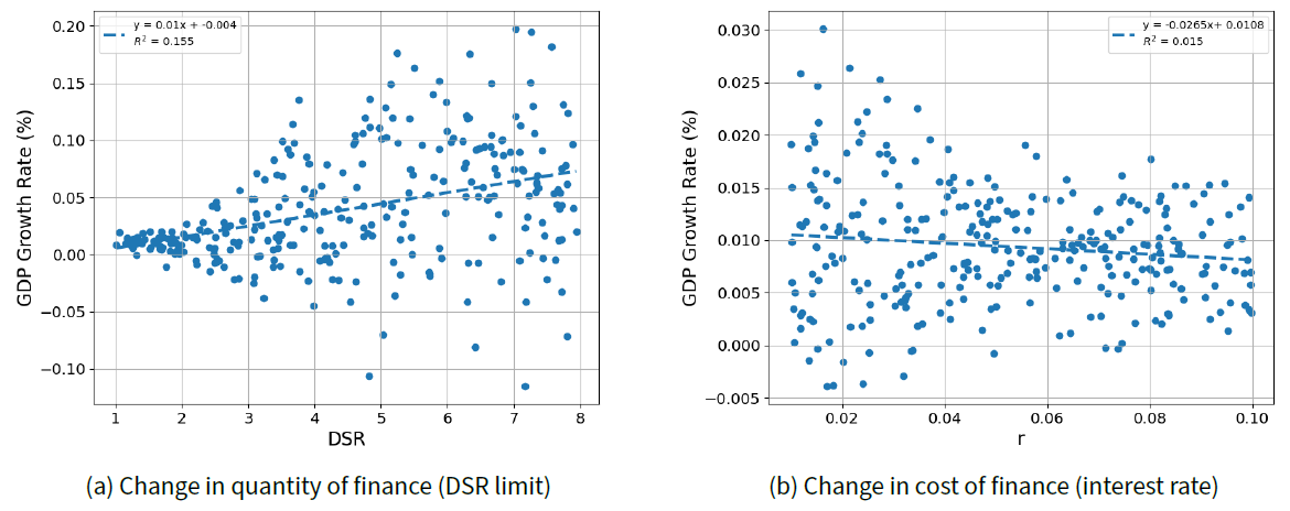 As shown in Figure 9, all three variables exhibit a linear trend with respect to changes in the interest rate, but a nonlinear trend with respect to changes in the DSR limit. Specifically, as the DSR limit increases, market concentration initially decreases and then rises again, whereas the economic growth rate and labor income share show the opposite pattern, first increasing and then declining. Notably, the negative correlation between market concentration and labor income share is prominently illustrated in this figure.