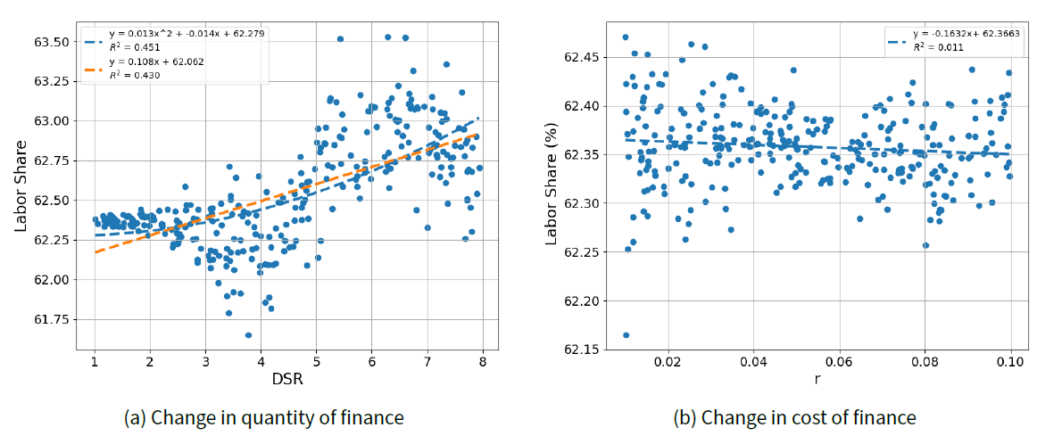 Additionally, the tipping point or inflection point shifts depending on the interest rate; the lower the interest rate, the higher the tipping point for the DSR limit. This indicates a synergistic effect of the two policies. When interest rates are low, a substantial relaxation of DSR regulations tends to benefit small firms. However, when interest rates are high, relaxing DSR regulations can disadvantage small firms by allowing them to dominate the market more easily. Lastly, the negative correlation between market concentration and labor income share, supported by previous studies, is more pronounced in Figure 9a and 9c.