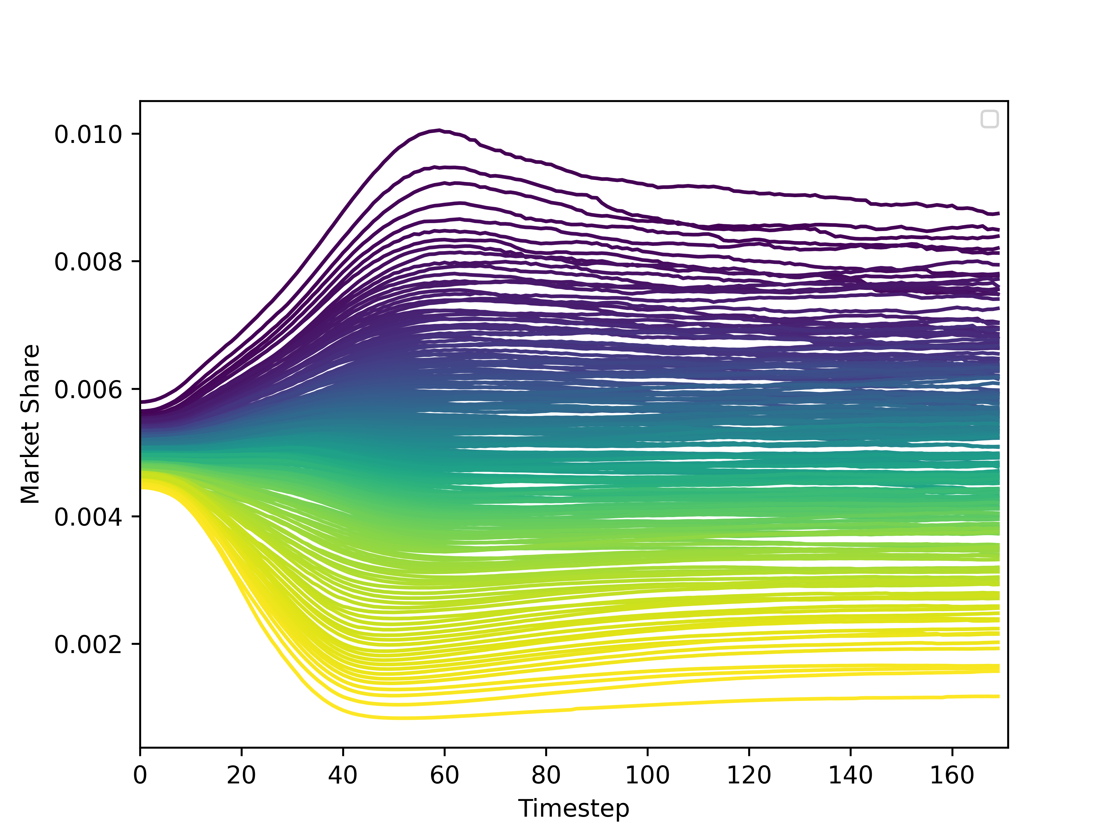 We tracked how the market shares of 200 individual consumer good firms evolved over time. The experiment was conducted using the same validated model input parameters as those listed in Table 2, and a single iteration was run. As shown in Figure 8, the firm sizes were almost identical. However, between timesteps 40 and 60, the companies diverged into either large or small firms through random interactions. Consequently, we discard the initial burn-in period and use the simulation output starting from timestep 50, when firm sizes have become sufficiently diverse in their distribution.