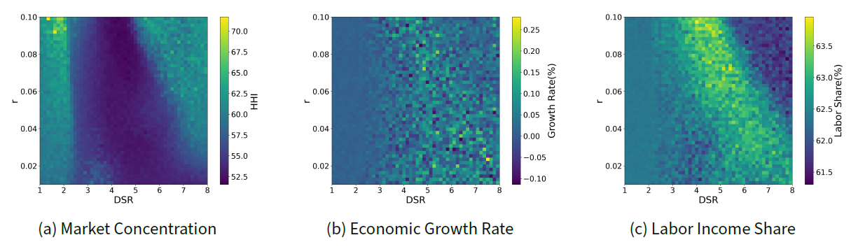 The following heatmap results are based on the simultaneous sampling of the DSR limit and interest rate, as outlined in Table 3 under ‘Exp 3.’ These results show changes in market concentration, economic growth rate, and labor income share when both policies are varied. In other words, the setup aligns with the joint regression analyses conducted for RQ 1 and RQ 2, with all the parameters other than the financial policy variables being identical to the calibrated parameters in Table 2.
