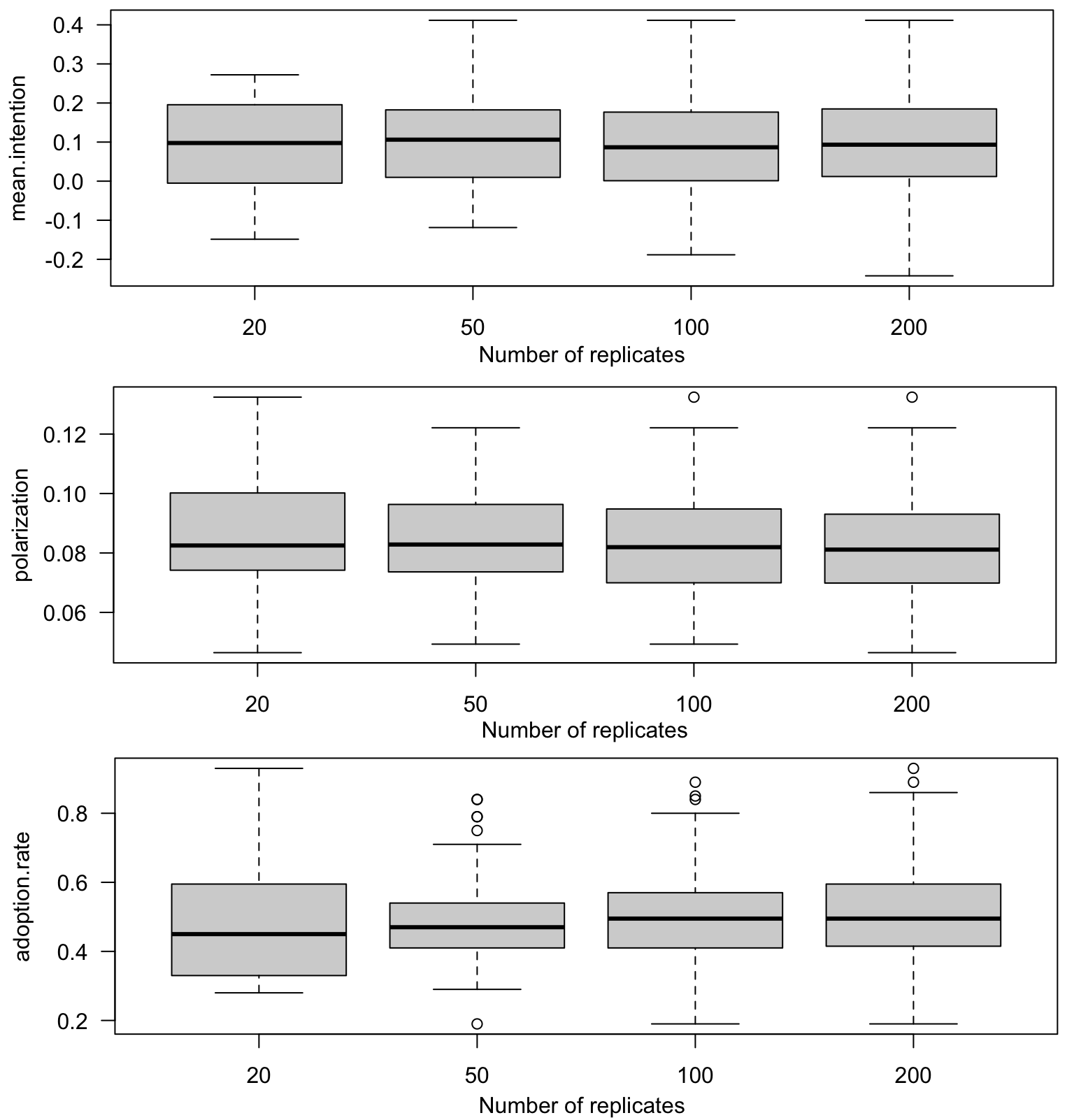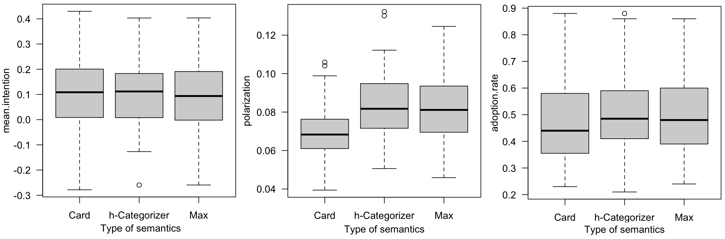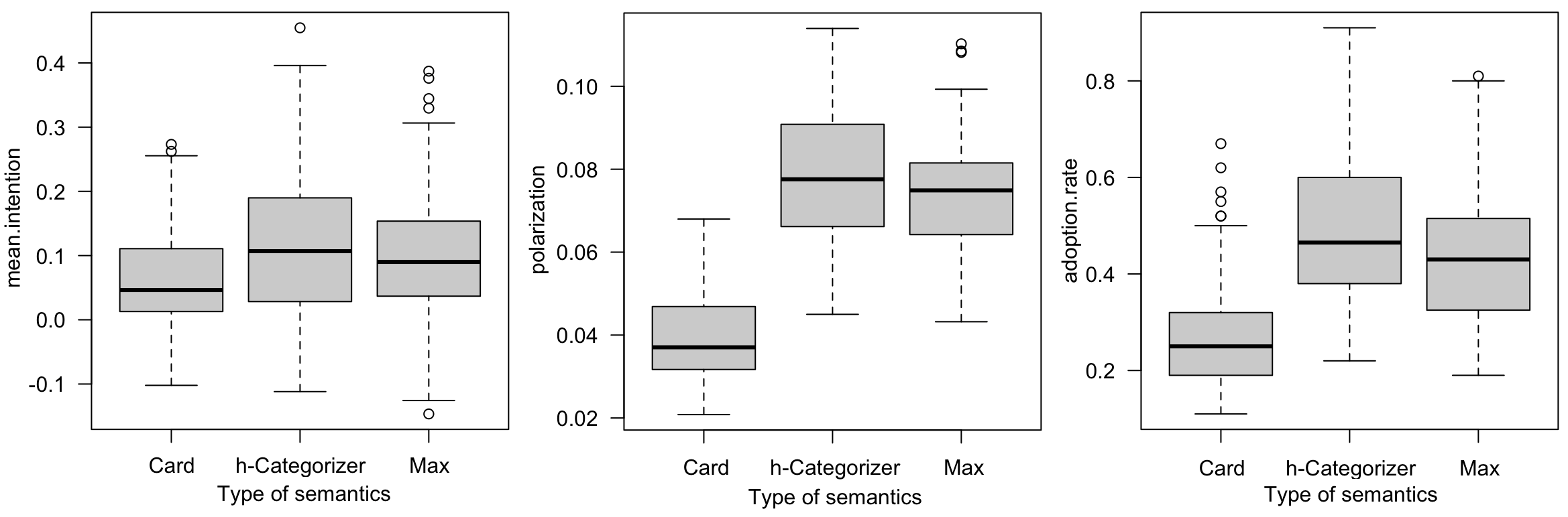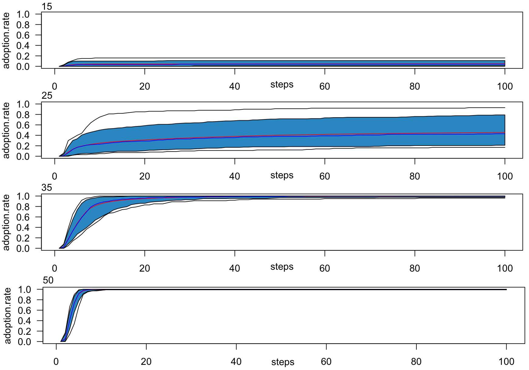 Figure 15 shows for 100 replications and 1000 time steps, the mean intention, and the rate of adopters for the different types of social network.