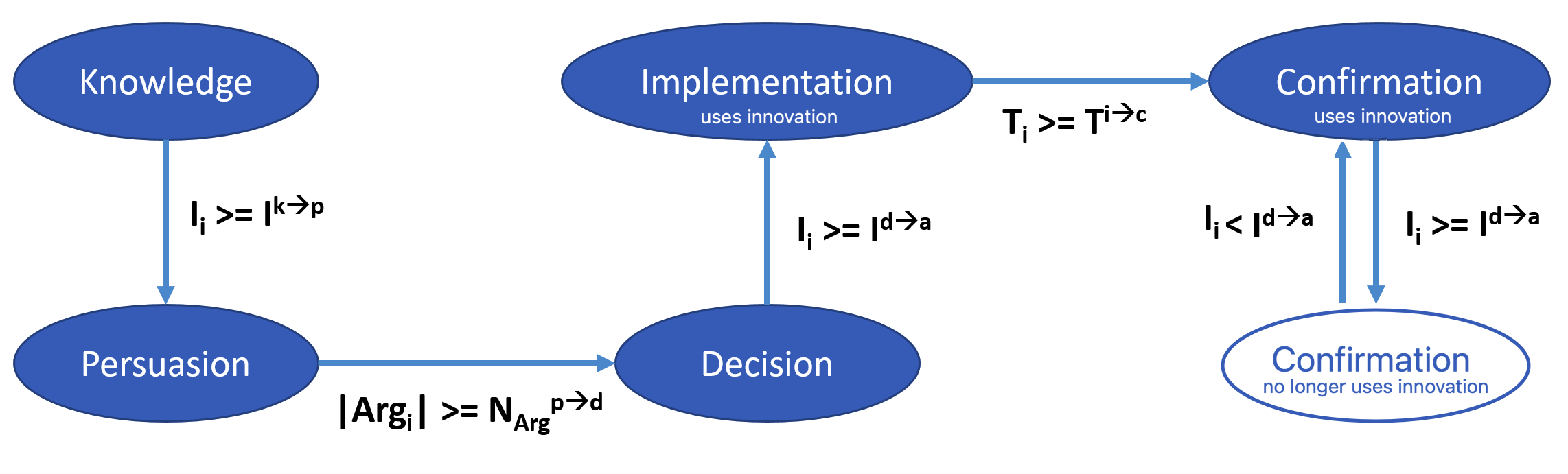 Process overview and scheduling. The behavior evolution of Individual agents regarding the innovation follows Rogers’ five stages and is influenced by three factors: the agents’ knowledge (i.e., the number of arguments they know about the innovation), their intention to adopt, and time. In MIDAO, this evolution is modeled using a finite state automaton that incorporates the five decision steps proposed by Rogers (see Figure 2). At the beginning of the simulation, the Individual agents are in the ‘Knowledge’ state: they are exposed to the innovation but have no interest in it and do not seek further information. If their intention to adopt surpasses a threshold \(I^{k \rightarrow p}\), they will enter the ‘Persuasion’ state, where they actively seek information to form an opinion. They will exchange arguments with others in their social network and search for information from communication channels. Once the agent has gathered enough information, i.e. when the number of arguments exceeds a threshold \(N_{Arg}^{p \rightarrow d}\), it enters the ‘Decision’ state, where it will decide whether to adopt the innovation. If the agent’s intention to adopt surpasses the threshold \(I^{d \rightarrow a}\), it will enter the ‘Implementation’ state and adopt the innovation. During the ‘Decision’ state, the agent will continue to search for information (by interacting with other agents or seeking out communication channels). After a certain period (when the time since adoption exceeds a threshold \(T^{i \rightarrow c}\)), the agent transitions to the ‘Confirmation’ state. In this state, the agent will continue to use the innovation if its intention to adopt remains above the adoption threshold \(I^{d \rightarrow a}\). Otherwise, the agent will stop using the innovation but may reconsider and reuse it again if its intention rises above the threshold \(I^{d \rightarrow a}\). In both the ‘Implementation’ and ‘Confirmation’ states, the agent no longer actively seeks information from communication channels but continues to engage in discussions with other agents about the innovation. Additionally, during the ‘Implementation’ state and the ‘Confirmation’ state with continued innovation usage, the agent can acquire new information (i.e., new arguments) through its experience with the innovation. Specifically, at each step, an Individual agent has a probability \(PU_{i}\) of uncovering an argument through the usage of the innovation. Indeed, by using the innovation, the agent can assess its benefits and drawbacks. The argument is randomly chosen from the set of arguments associated with the innovation’s usage.