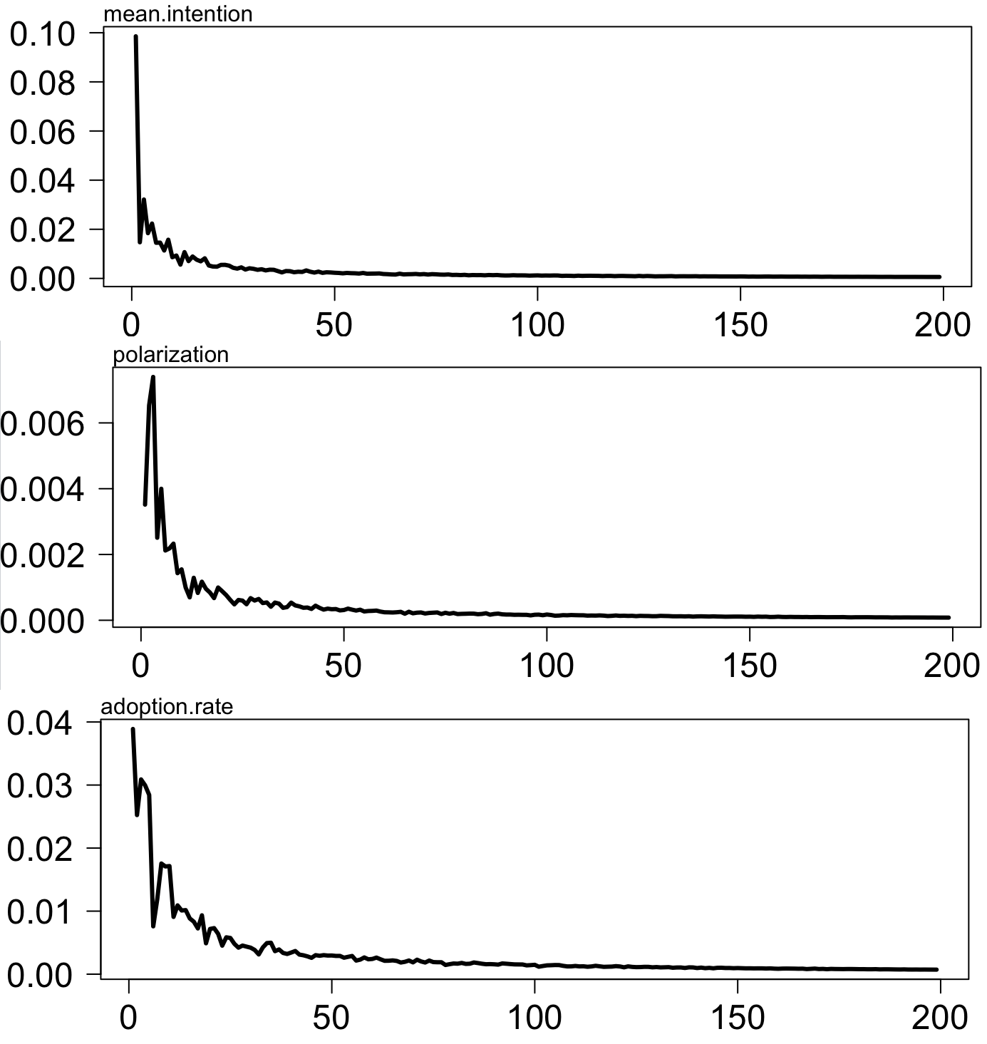 Observation. The key metric observed is the adoption rate (agents in the ‘Implementation’ or ‘Confirmation’ states), which includes both the rate of new adopters over a given period and the cumulative adoption rate. Additionally, the Individual agents’ intentions to adopt is of particular interest. Furthermore, we observe the final polarization of the agents’ intention.