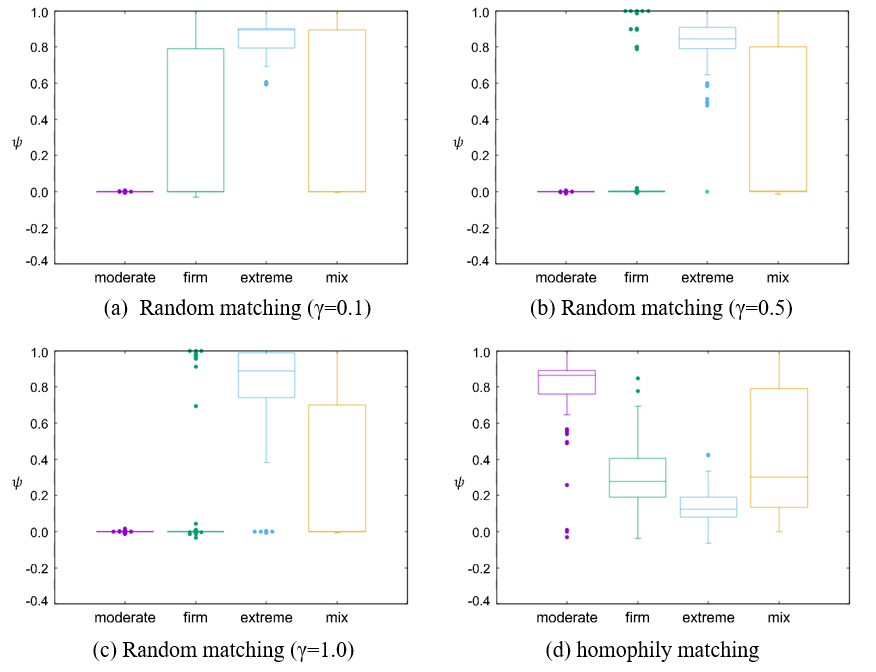 Under these conditions, we conducted experiments in two scenarios: random matching and homophily matching. In random matching, we examined three conditions based on followee swapping probability: low probability (\(\gamma= 0.1\)), moderate probability (\(\gamma= 0.5\)), and full followee replacement (\(\gamma= 1\)). For each scenario, we evaluated four patterns of agent partisanship intensity: (1) “moderate”, (2) “firm”, (3) “extreme”, and (4) “mixed”. In (4) “mixed”, the agents’ partisanship is randomly selected from “moderate”, “firm”, and “extreme”. Here, we compare and evaluate the oil spill polarization rate, \(\psi\), under each condition. We then present the results regarding the conditions under which oil spill polarization occurs.