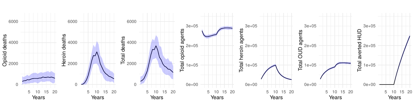 However, modeling each specific intervention or bundle of interventions in all of its policy and contextual nuances can become both unmanageable and quickly outdated, given the evolving nature of opioid-related interventions. Consequently, we opted for a consolidated approach that models generic reductions in transition rates to heroin/synthetic opioid use disorder. By using 50% and 100% reductions, we can capture a range of possible intervention outcomes—from partially to fully effective policies—without tying our analysis to a single policy measure. This approach ensures that our findings remain broadly relevant to a variety of present-day and future prevention strategies, illustrating how long-term reductions in opioid-related mortality might unfold under different effectiveness levels.