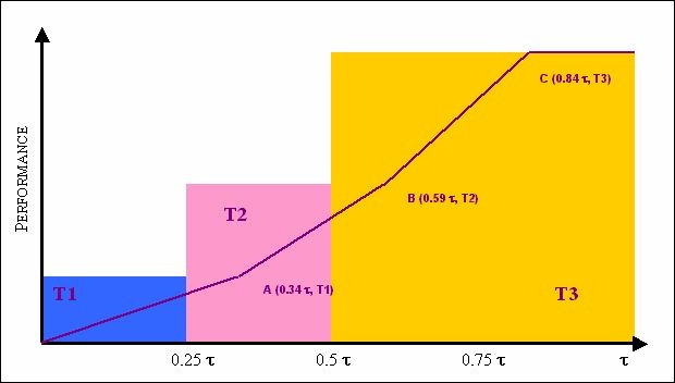 | Figure 1. The evolution of the technology and market environment: τ is the number of the cycles of simulation. T1, T2 and T3 are the three available technological regimes over time. The coloured areas define all the possible technological positions of firms in respect to the technology standard evolution, and all the related levels of performance which firms can achieve over time. Obviously, technological evolution is conceived as an irreversible process. |