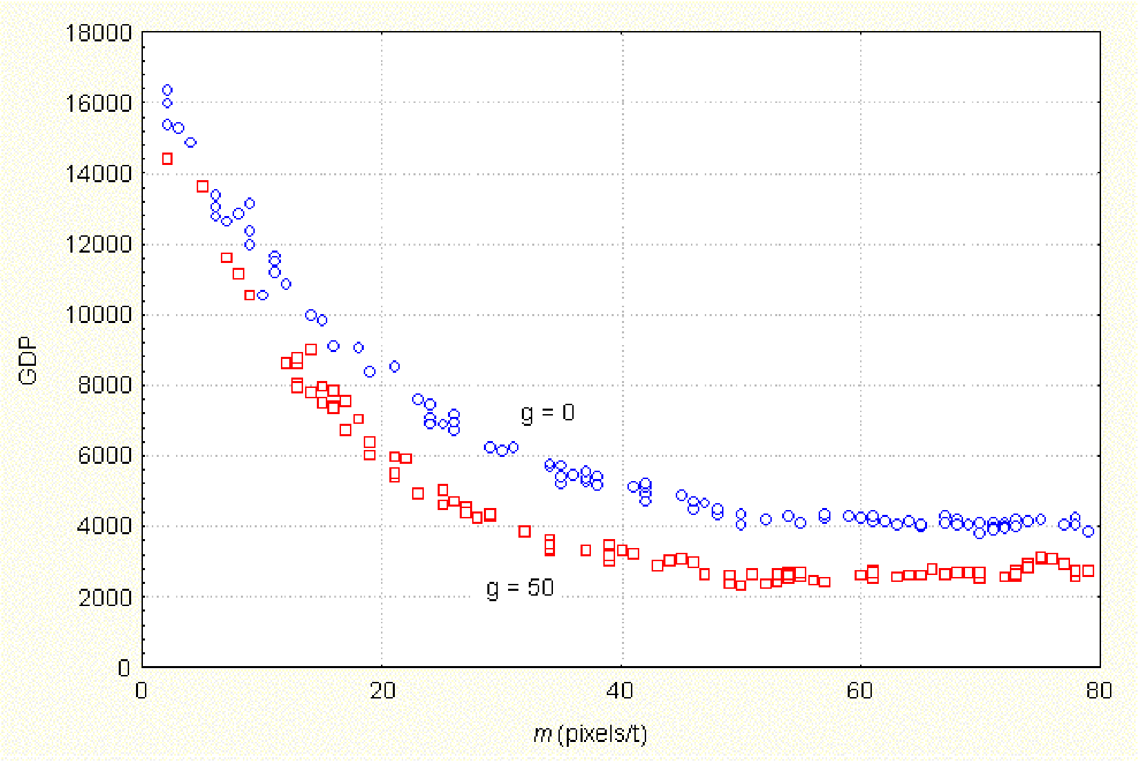 | Figure 3. Total wealth accumulated (GDP) at different speeds of movement (m) of agents. tstep = 80, RD = 1, RN = 1, RS = 100, τ = 2, b = 5, a = 2 |