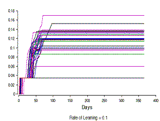 | Figure 6. The 'Development of Knowledge' life style (KLS) of 100 individuals with a constant rate of learning of 0.25, for a period of a year |