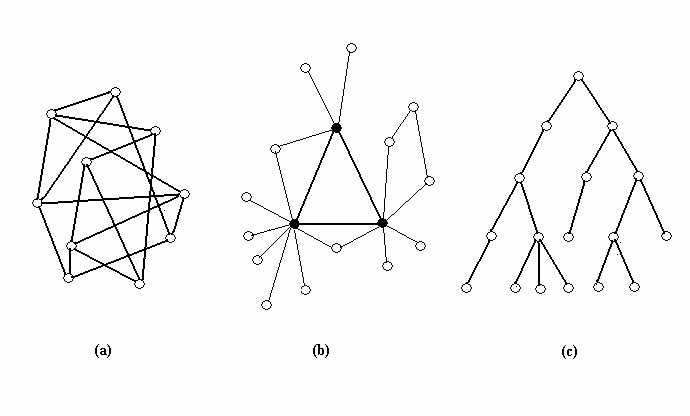 | Figure 1. Representation of network structures: (a) random, (b) scale-free and, (c) hierarchical (Stocker et al. 2001) |