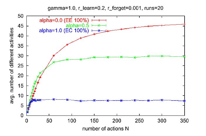 | Figure 5. Average number of different activities in an interval of 50 time steps for different a. Measurement started at time step 500, such that the transient phase at the beginning is not considered. Simulation time 1000 time steps for each run. Parameter setting: normal learning rate rlearn = 0.2, low forgetting rate rforget = 0.001, number of activities N = 20. |