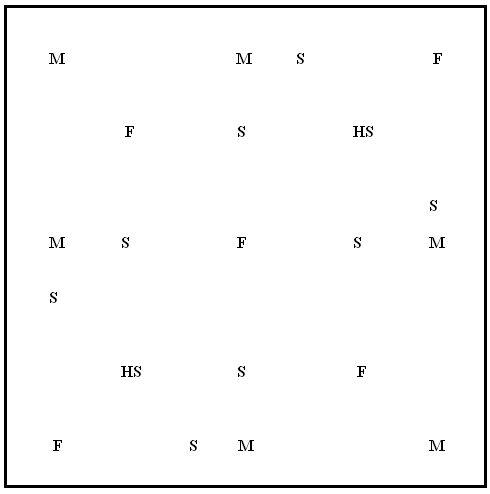 | Figure 1. Landscape for the simulations. F: Food Center; M: Material Center; S: Shelter; HS: Home Shelter. |