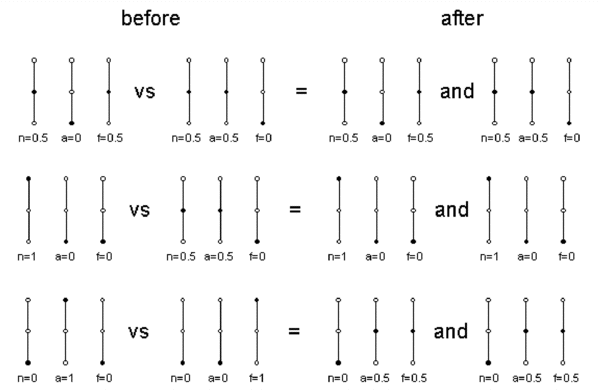 | Figure 1. Examples of three different agents: agent with indeterminate socio-political type (neo-liberal component is 0, alternative component is 0.5 and fundamentalist component is 0.5), neo-liberal agent (n=1, a=0, f=0) and alternative agent (n=0, a=1, f=0) |