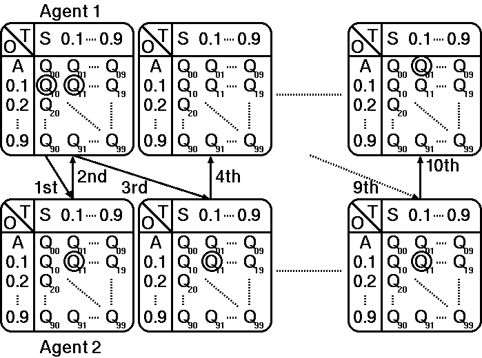 Q(t,o)=Q(t,o)+&alpha[r+&gamma maxo'&isin O(t') Q(t',o')-Q(t,o)]   ....   (1)