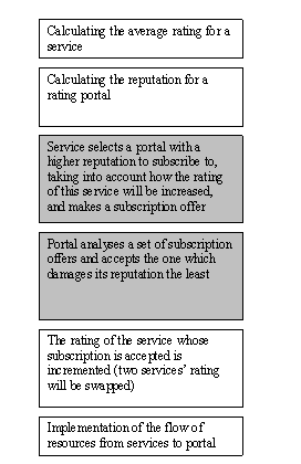 As a result, both services #1 and #2 quickly run out of resources without gaining much rating, because they directly compete only with each other. A more rational strategy for a service would be to avoid getting into a cycle by choosing the second best portal with respect to its reputation and obtain the rating of service #1 at this portal. Such increased rationality will be beneficial for #2 but not other services, and will not allow portals to have an "easy ride" with respect to collecting resources and not giving up reputations in the above cycle scenario.