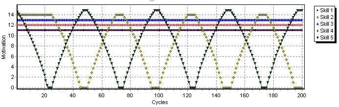 Here we see that, initially, the agents seem to specialise in one skill. However, at the 77th cycle, they develop expertise in the second skill. This is 'right on time', because the expertise in the second best skill has almost dropped below its threshold of 10. This explains why a boredom-recovery rate less than 29 will not result in a task rotation process.