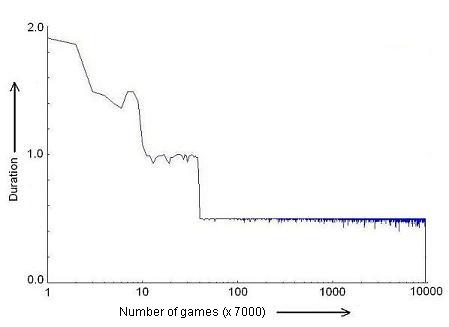 | Figure 5. The average duration of a schwa vs. the number of games. The plot is for the final schwa of the word karAka. The number of games is 7000 times the number shown in the plot. The scale is logarithmic |