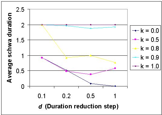 | Figure 7. The dependence of average schwa duration on d (duration reduction step) and learning threshold k (=ksn= ksm). Other simulation parameters: vocabulary size = 7, N = 4, psn = 0.6, psm =0.2, pfn = 0.6, pfm = 0.0, number of games=300000. The expected duration according to Ohala's rule is 1.07 |